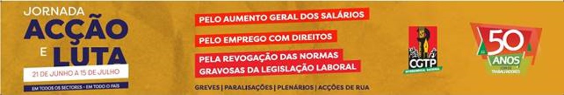 A CGTP-IN tem a decorrer a Jornada de Acção e Luta que teve início no dia 21 de Junho e durará até 15 de Julho, em todos os sectores e em todo o país, com greves, paralisações, plenários e acções de rua, sob o lema “Pelo aumento geral dos salários! Pelo emprego com direitos! Pela revogação das normas gravosas da legislação laboral!” Ver mapa de iniciativas