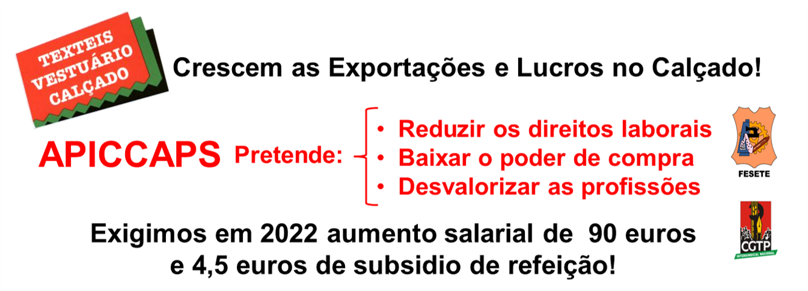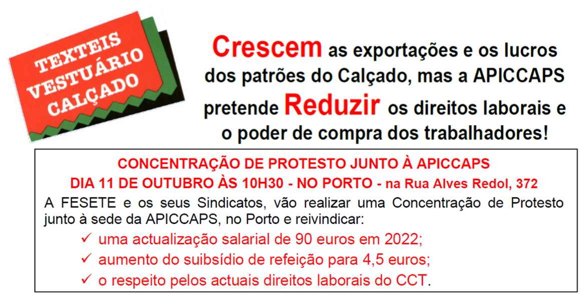A FESETE e os seus Sindicatos filiados vão realizar no dia 21 de Dezembro, quarta-feira, entre as 10h30 e as 12h00, uma Concentração de dirigentes sindicais, junto à Loja Comercial do Presidente da APICCAPS, Luis Onofre, sita na Avenida da Boavista, nº 3483, no Porto, com o objectivo de manifestar o seu protesto público contra o congelamento dos salários em 2022, a retribuição salarial de uma parte significativa dos trabalhadores apenas no Salário Mínimo Nacional, e um subsídio de refeição diário, no valor de 2,5 euros. Ler mais - CLIQUE AQUI