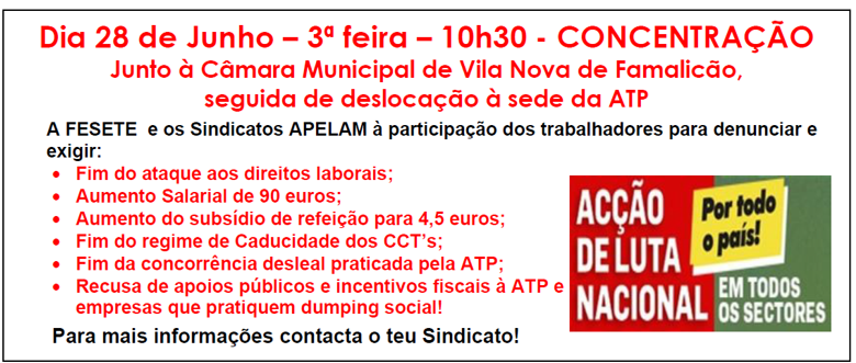 CONCENTRAÇÃO de Dirigentes Sindicais e Trabalhadores Têxteis e Vestuário em Vila Nova de Famalicão, dia 28 de Junho, às 10h30 - Seguida de Desfile até à sede da ATP